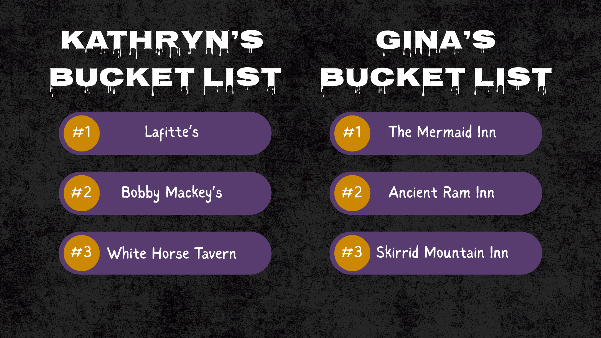 Are we telling each other right away? Okay, okay. You got number one correct. Mermaid Inn 100%. Yes, that is my number one. Smugglers, the tunnels, I want it, I want it all. I actually put the Ancient Ram Inn as number two.